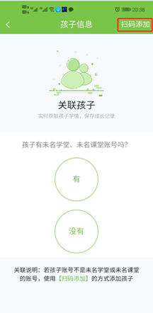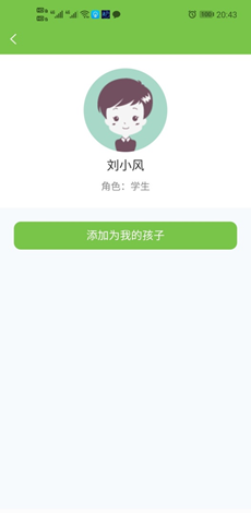 步骤2:家长在已登录家长云APP的情况下,点击【扫码添加】或【扫一扫】按钮,扫描学生二维码,点击【添加为我的孩子】,学生通过申请即成功关联孩子。