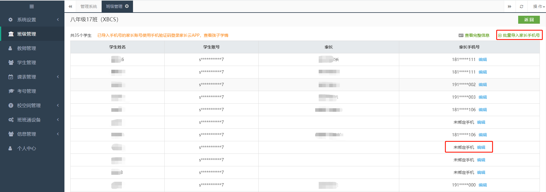 方式一:学校管理员导入家长手机号。在管理系统【班级管理】--【编辑家长手机】模块批量导入或单个编辑绑定家长手机,被导入的手机自动绑定学生,家长可在家长云APP直接使用手机验证码的方式登录。